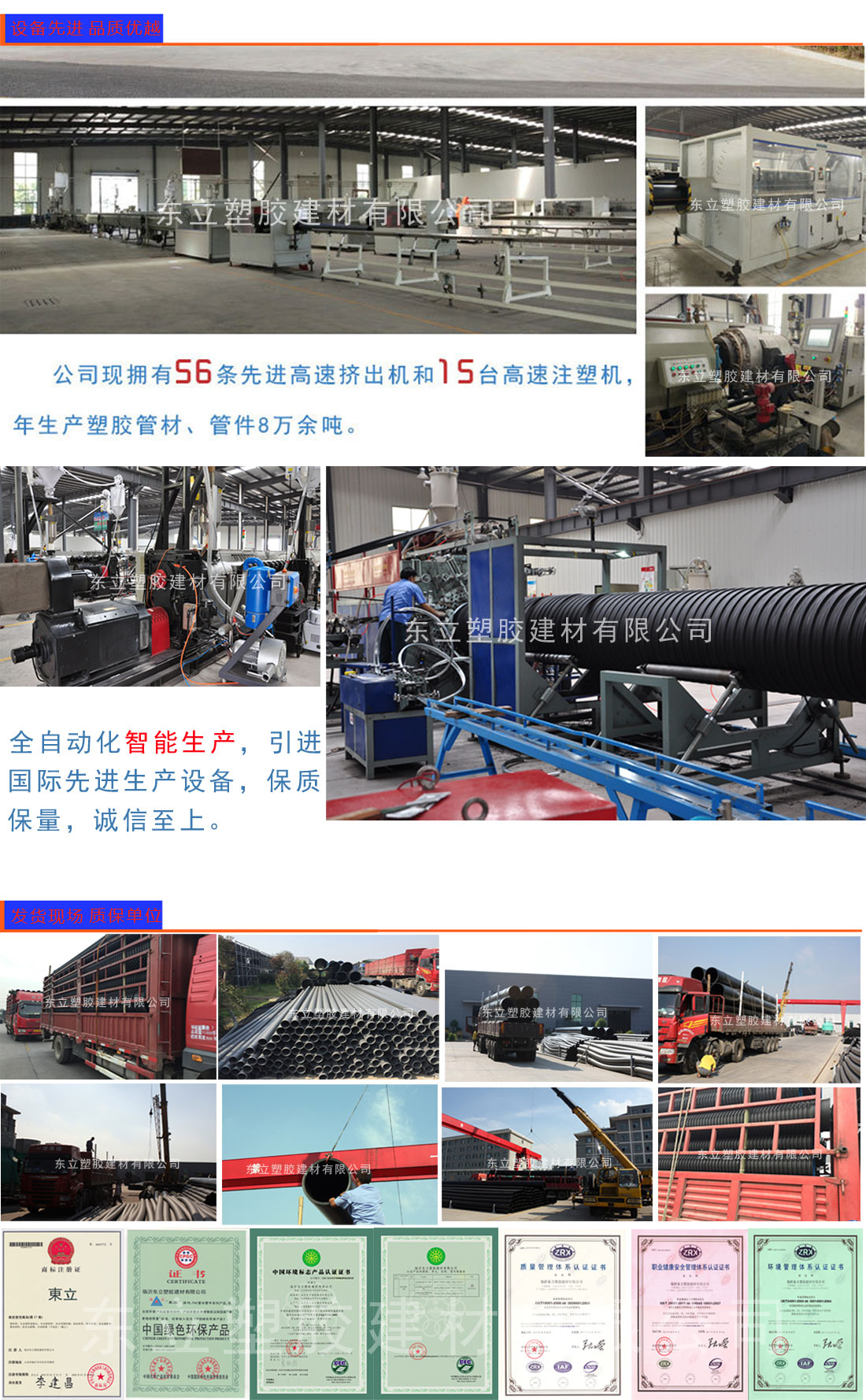 PE管采用目前世界上最先進的技術(shù)生產(chǎn)制造的,具有高速擠出成型,熔融適度,自動定尺切割,PLC控制生產(chǎn)全過程的先進性能。